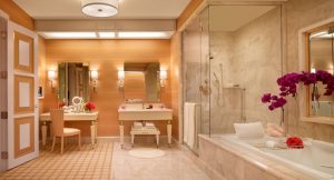 – Bathrooms floor and wall coverings, soap dishes, door surrounds, thresholds with Crema Belissima marble.